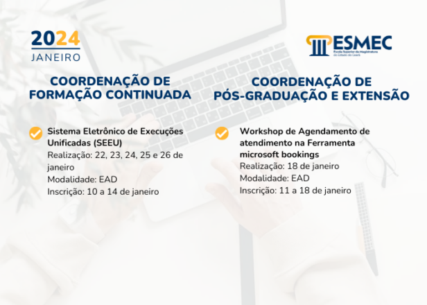 A Escola Superior da Magistratura do Estado do Ceará (Esmec) divulga a programação para o mês de janeiro. Na agenda acadêmica estão previstos o curso de um curso de Formação Continuada e um Workshop da plataforma Microsoft Bookings.