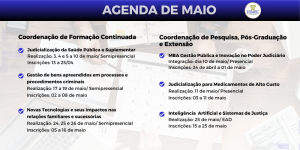 A Escola Superior da Magistratura do Estado do Ceará (Esmec) divulga a programação para o mês de maio. Na agenda acadêmica estão previstos três cursos de formação continuada, aula inaugural do curso de MBA e duas palestras abertas ao público.