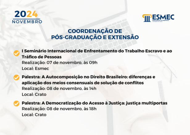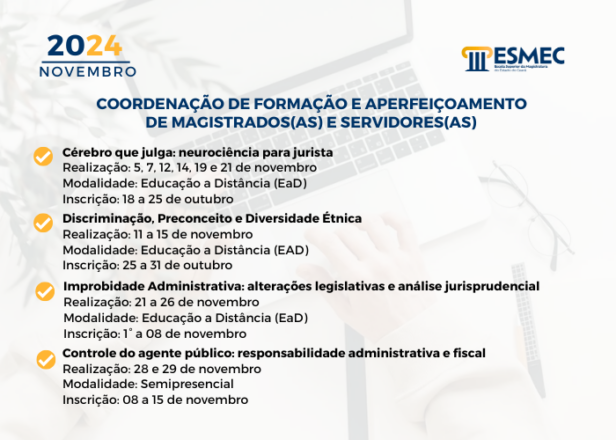 A Escola Superior da Magistratura do Estado do Ceará (Esmec) divulga a programação do mês de Novembro. Na agenda acadêmica estão previstos quatro (4) cursos de Formação Continuada e três (3) eventos abertos ao público.