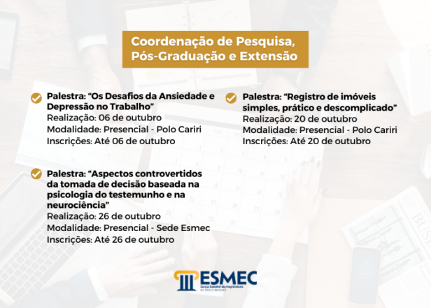 A Escola Superior da Magistratura do Estado do Ceará (Esmec) divulga a programação para o mês de outubro. Na agenda acadêmica estão previstos cinco cursos de formação continuada e quatro palestras, tanto na sede como no polo Cariri.