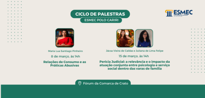 A Escola Superior da Magistratura do Estado do Ceará (Esmec) promoverá ciclo de palestras no Polo do Cariri nos meses de fevereiro e março de 2024. As ações educativas acontecerão no Fórum da Comarca de Crato.