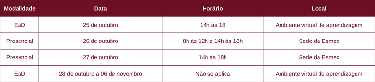 As inscrições podem ser realizadas até 17 de outubro pelo formulário eletrônico e finalizadas pelo sistema Educa Enfam. Ao efetuar a inscrição, o educando será direcionado automaticamente para a lista de espera. Caso o número de inscritos exceda o número de vagas, serão observados os critérios presentes no Regimento Interno da Esmec para seleção dos participantes.