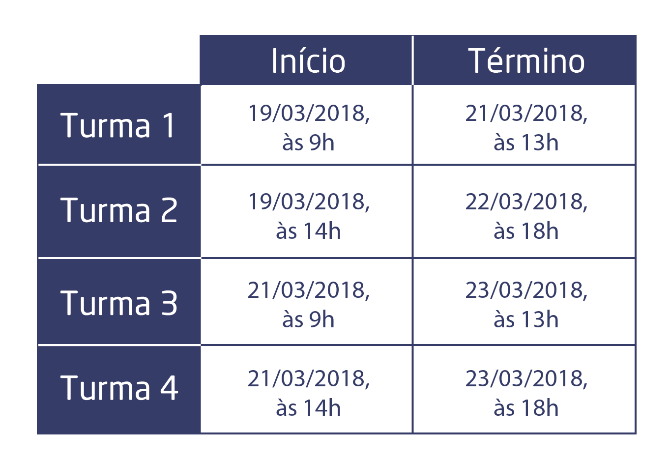 As quatro turmas do curso serão compostas por até 20 participantes cada uma, conforme o cronograma abaixo.