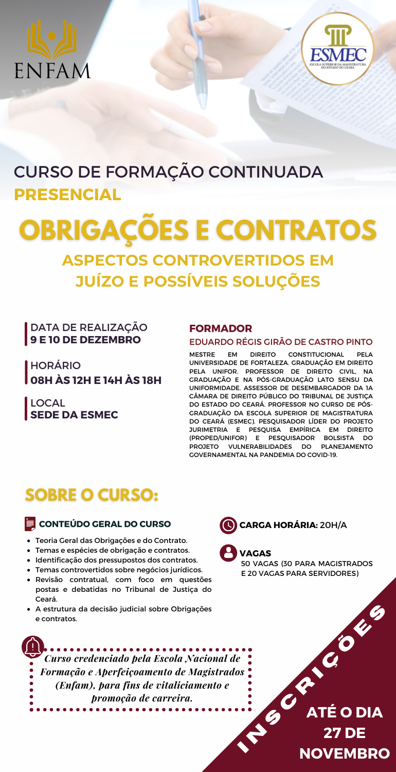 A Escola Superior da Magistratura do Estado do Ceará (Esmec) promove nos dias 9 e 10 de dezembro, das 8h às 12h e 14h às 18h, na sede da Esmec, o curso de formação continuada “Obrigações e contratos: Aspectos controvertidos em juízo e possíveis soluções”. A ação educativa conta com a formação de Eduardo Régis Girão de Castro Pinto.
