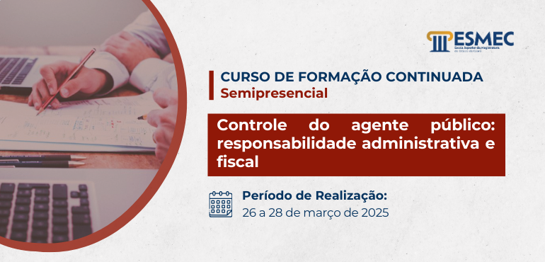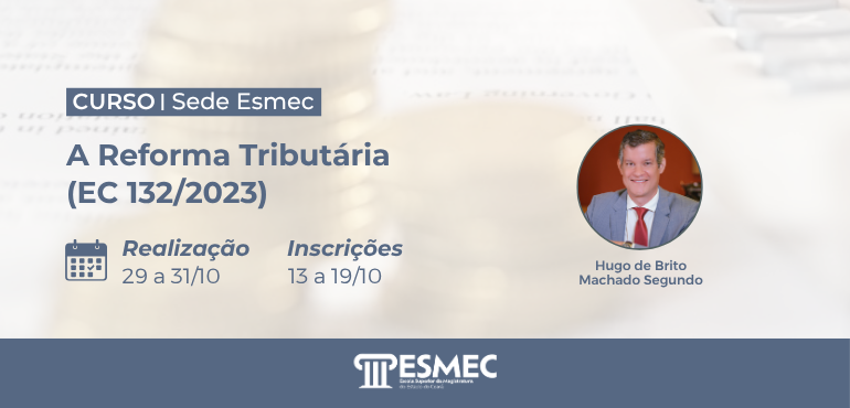 A Escola Superior da Magistratura do Estado do Ceará (Esmec) realizará, entre os dias 29 e 31 de outubro de 2025, o curso de Formação Continuada “Reforma Tributária (EC 132/2023)”, com o formador Dr. Hugo de Brito Machado Segundo, na modalidade semipresencial, de acordo com o seguinte cronograma: Data Modalidade Horário Local 29/10 EaD […] |