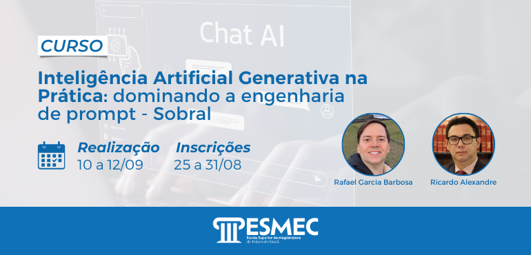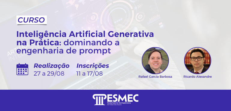 O curso “Inteligência Artificial Generativa na Prática: dominando a engenharia de prompt” vai ter uma nova edição, agora na sede da Escola Superior da Magistratura do Estado do Ceará (Esmec). De 12 a 14 de novembro, a capacitação será realizada pelos formadores Ricardo Alexandre da Silva Costa e Rafael Garcia Barbosa, na modalidade semipresencial. As […] |