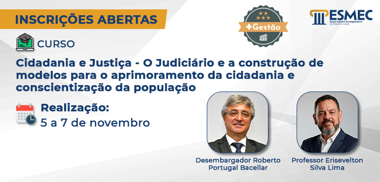 Com o tema “Cidadania e Justiça – O Judiciário e a construção de modelos para o aprimoramento da cidadania e conscientização da população”, o curso de Formação Continuada será realizado na Escola Superior da Magistratura do Estado do Ceará (Esmec) entre os dias 5 e 7 de novembro. Os formadores da capacitação serão o […] |