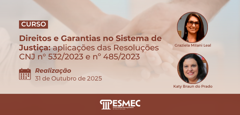 A Escola Superior da Magistratura do Estado do Ceará (Esmec) promoverá, no dia 31 de outubro de 2025, das 09 às 12 h e das 14 às 17h, o curso “Direitos e Garantias no Sistema de Justiça: aplicações das Resoluções CNJ nº 532/2023 e nº 485/2023”, tendo como formadoras Graziela Milani Leal e Katy […] |