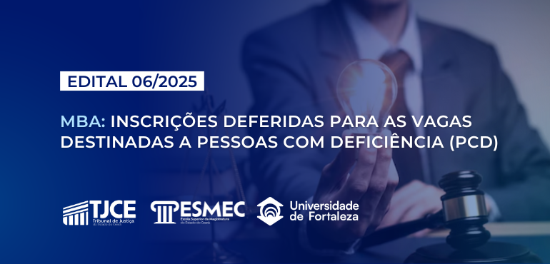A Escola Superior da Magistratura do Estado do Ceará (Esmec) divulga, por meio do Edital n° 06/2025, publicado nesta segunda-feira (6/10), o resultado provisório das inscrições para participação na seleção em vagas destinadas a pessoas com deficiência no MBA em Gestão Pública e Inovação no Poder Judiciário. A lista dos candidatos(as) deferidos e indeferidos […] |
