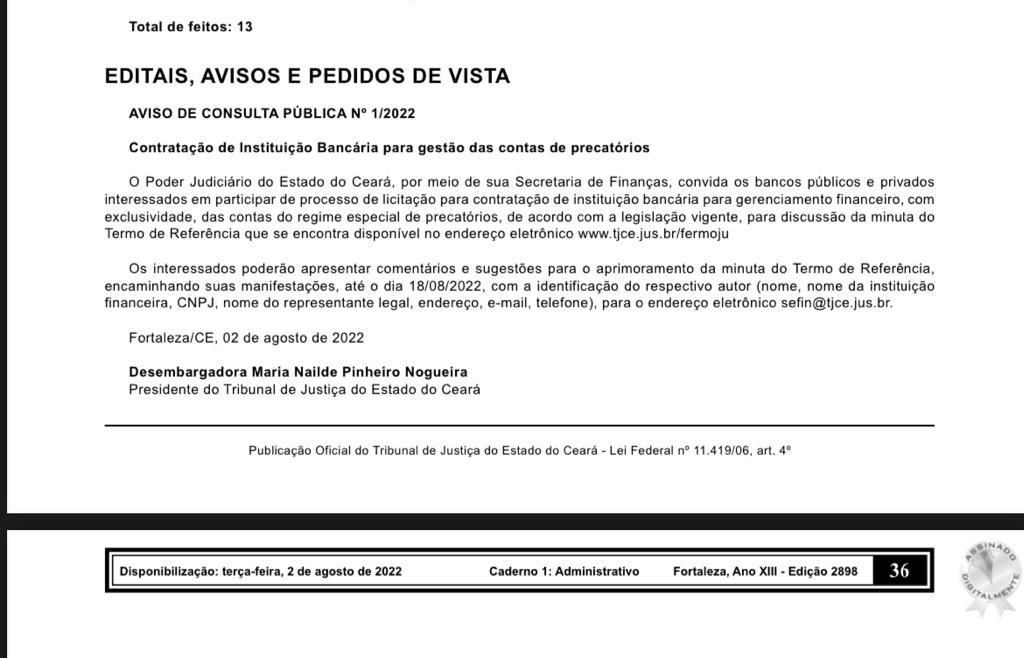 • Conta Única de Depósitos Judiciais à Disposição da Justiça do Estado do Ceará