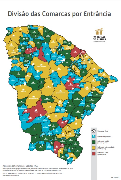 Clique abaixo e veja as comarcas divididas por entrâncias Inicial (pequeno porte), Intermediária (médio porte) e Final (grande porte). Clique para aumentar a imagem.