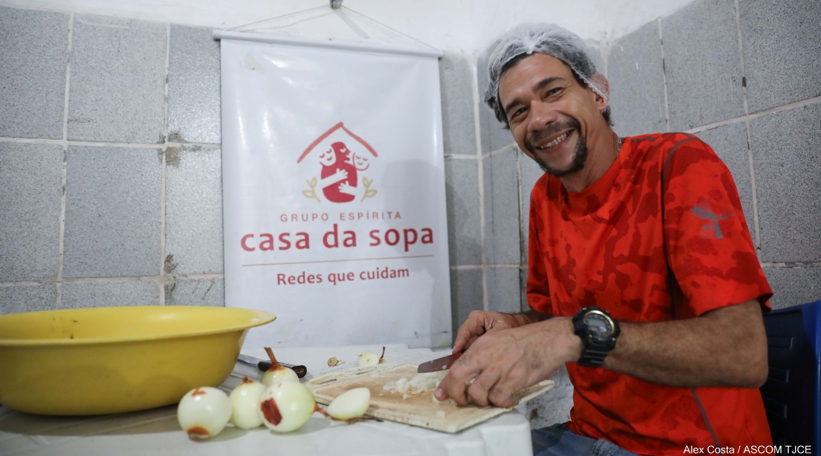 Ele é auxiliar de cozinha da dona Regina no Centro Espírita Casa da Sopa, que recebe recursos do programa Ceará Sem Fome. De segunda a sexta-feira, os dois são responsáveis por preparar refeições para pelo menos 100 pessoas em situação de vulnerabilidade social, como a Camila* e a dona Ângela.