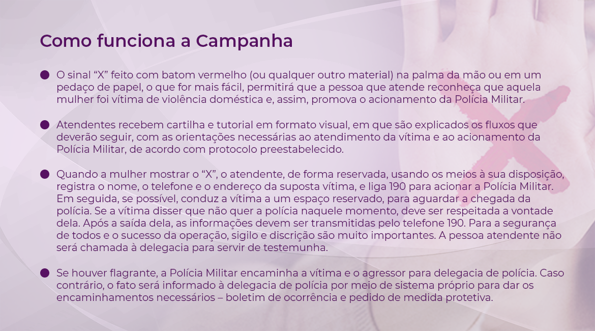 Foi neste contexto que a campanha Sinal Vermelho foi idealizada pelo CNJ, a fim de permitir que as mulheres em todo país possam pedir ajuda de forma discreta e silenciosa. Inicialmente, a parceria foi proposta com farmácias, por serem locais de fácil acesso e que permaneceram com o serviço presencial durante o isolamento. Posteriormente, outros estabelecimentos aderiram à mobilização.
