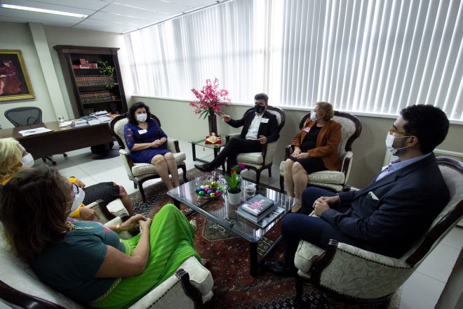 Se você é usuário do transporte público de Fortaleza, já deve ter se deparado com cartazes da campanha Justiça pela Mulher, iniciativa do Judiciário cearense de enfrentamento à violência doméstica. As peças anexadas nos ônibus trazem ainda os canais de denúncia, anunciados pelo músico Waldonys, embaixador da campanha. Nesta terça-feira (07/12), o artista se reuniu com a presidente do Tribunal de Justiça do Ceará (TJCE), desembargadora Maria Nailde Pinheiro Nogueira, no Fórum Clóvis Beviláqua. Também participaram do encontro a desembargadora Marlúcia de Araújo Bezerra, que está à frente da Coordenadoria Estadual da Mulher em Situação de Violência Doméstica e Familiar do TJCE, e as juízas Rosa Mendonça e Teresa Germana Lopes de Azevedo, titulares do 1º e do 2º Juizados da Mulher de Fortaleza, respectivamente.
