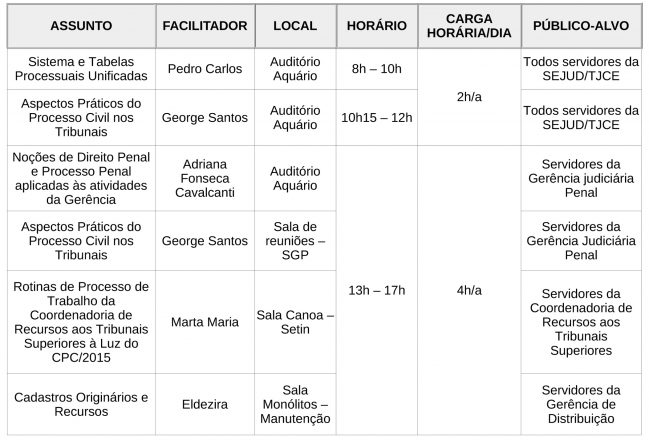 Nos dois dias, a capacitação terá dois momentos: o primeiro, pela manhã, é destinado a todas as áreas e abordará o Sistema e Tabelas Processuais Unificadas e os Aspectos Práticos do Processo Civil nos Tribunais. No segundo momento, à tarde, os assuntos serão temáticos e específicos para cada um dos setores.