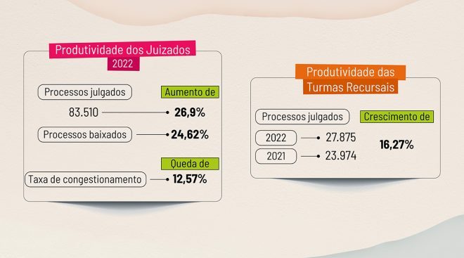 Nas Turmas Recursais, a quantidade de processos julgados também aumentou, passando de 23.974, em 2021, para 27.875, em 2022. Crescimento de 16,27%.