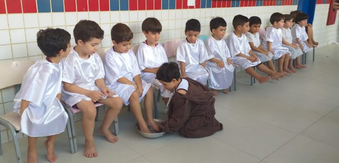 A Creche do Poder Judiciário do Ceará promoveu, nesta quarta-feira (17/04), encenação de momentos da “Paixão de Cristo”, dentro da programação da Semana da Páscoa. Participaram 17 alunos dos Infantis 4 e 5, com a presença dos demais estudantes e dos colaboradores da unidade educacional.