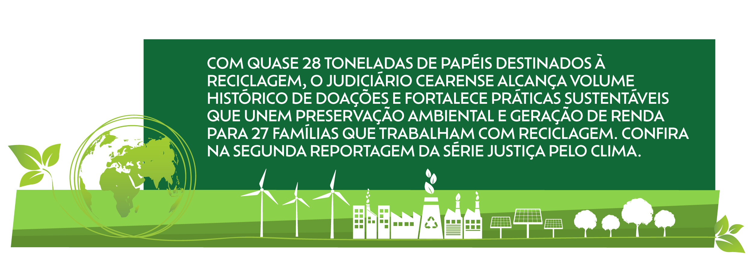 As discussões sobre justiça climática, justiça social e estratégias para enfrentar os efeitos das mudanças ambientais também encontram espaço no Tribunal de Justiça do Ceará (TJCE), que vem consolidando práticas sustentáveis para reduzir impactos ambientais e fortalecer a gestão eficiente de recursos naturais, alinhando-se aos compromissos da 30ª Conferência da ONU sobre Mudanças Climáticas (COP30), que ocorre em Belém (PA) neste mês de novembro. O TJCE não apenas fortalece práticas sustentáveis, mas gera também benefícios sociais ao apoiar trabalhadoras(es) que vivem da reciclagem.