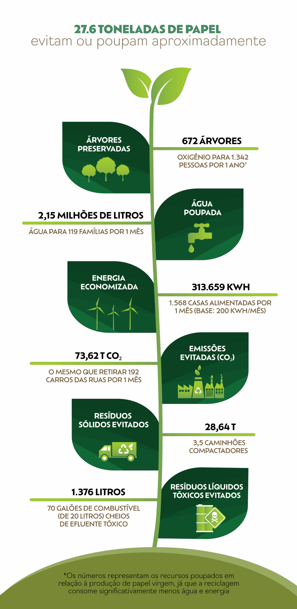 A doação de 28 toneladas de papel à Associação Rosa Virgínia representa um ganho ambiental expressivo: são cerca de 672 árvores preservadas, aproximadamente 2,15 milhões de litros de água poupados e aproximadamente 313,7 mil kWh de energia economizada, além de evitar a emissão de 73,62 tCO₂, o equivalente a retirada de 192 carros das ruas durante um mês inteiro. Esses números evidenciam como ações institucionais podem gerar resultados concretos na preservação do meio ambiente.