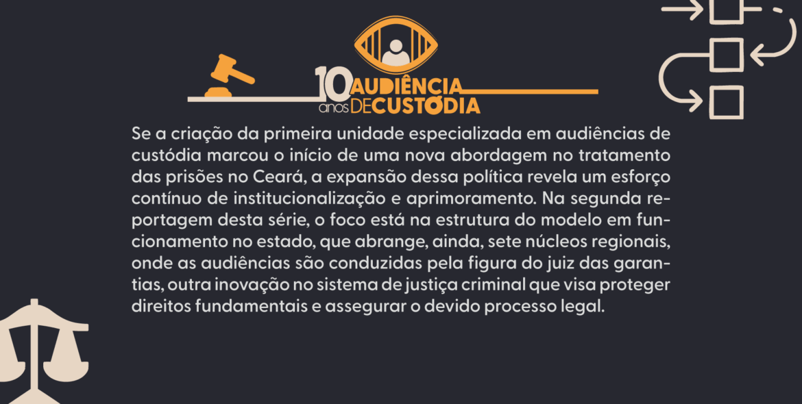 Há uma década, o Estado do Ceará deu um passo decisivo em sua trajetória ao incorporar a audiência de custódia como prática permanente. No período que segue, medidas importantes foram tomadas para que esse trabalho seja conduzido com eficiência e segurança, com a definição de um fluxo de atividades e a criação de uma infraestrutura especializada.
