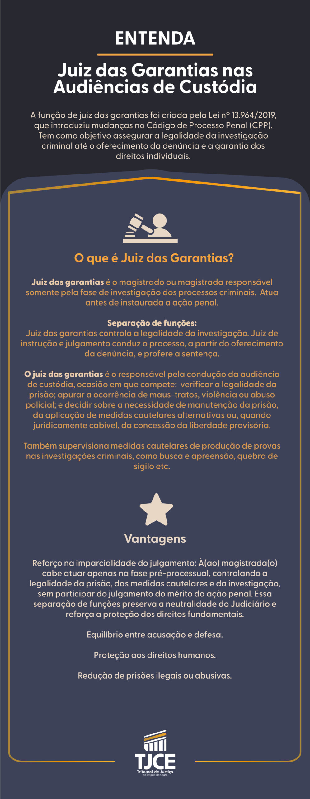 No Ceará, a implantação do juiz das garantias foi regulamentada pela Resolução do Pleno do TJCE nº 14/2024, seguindo as diretrizes da Resolução nº 562/2024 do Conselho Nacional de Justiça (CNJ). Desde então, além de realizar audiências de custódia, a magistrada ou magistrado responsável pelo NCG também profere decisões acerca de medidas cautelares e zela pelo controle da legalidade da investigação criminal, exceto em casos de violência doméstica e familiar, fatos que envolvam organizações criminosas ou relacionados a crimes dolosos contra a vida, para os quais existem varas especializadas.