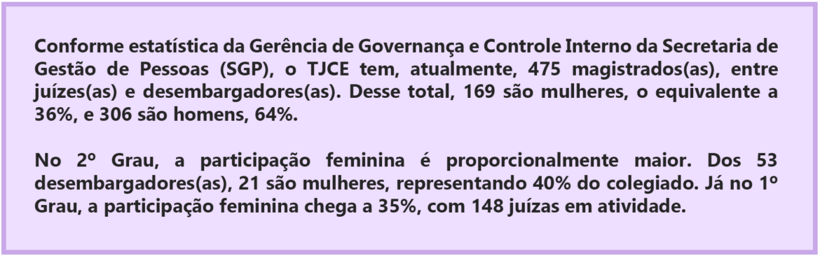 Entre as ações de incentivo está o Programa de Fortalecimento de Lideranças Femininas, por meio do qual foi lançado o Comitê Gestor de Equidade de Gênero. A iniciativa integra a Estratégia de Transformação Digital do TJCE, viabilizada pelo Programa de Modernização do Poder Judiciário (Promojud), e está alinhada ao Objetivo de Desenvolvimento Sustentável (ODS) nº 5 da Agenda 2030 da ONU, que trata da igualdade de gênero, inclusão feminina e orientação profissional para quem deseja ocupar posições de liderança. Clique AQUI para saber mais.
