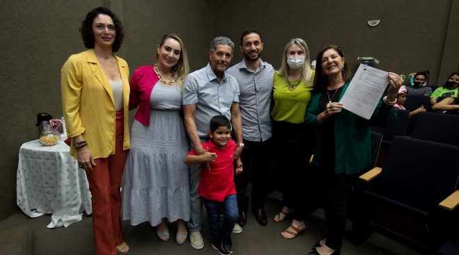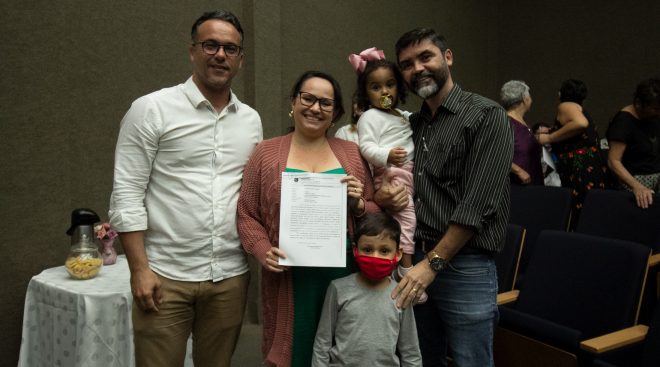 Keiliane Viera e Geziel Alves comemoraram o recebimento do mandado de adoção de Emanuel, de cinco anos. “Mal consegui dormir direito essa noite porque é um momento muito esperado, né? A gente passa por todo um processo, avaliações. Então é emocionante saber que agora ele finalmente vai ganhar o sobrenome da família”, afirmou a mãe.