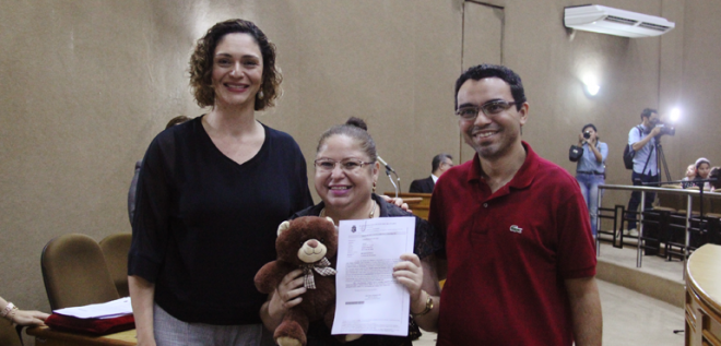 A juíza Alda Holanda, da 3ª Vara, relembrou a primeira solenidade que realizou, em 2014. “Foram entregues seis adoções na sala de audiência. Hoje, temos 49 do mês passado e três deste mês, totalizando 52. Um recorde para a unidade”, disse. Ela acrescentou ainda que, “tenho muita alegria e satisfação por vocês abraçarem essa causa.”