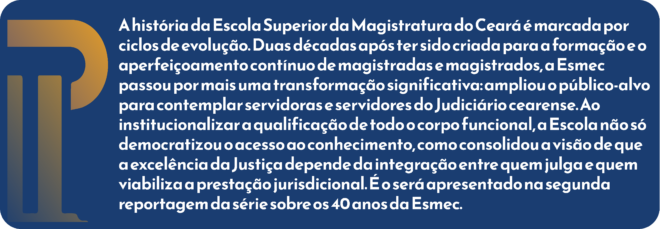 As trajetórias de aperfeiçoamento profissional de Luana, Luís, Sofhia e de tantas outras servidoras e servidores só foi possível graças a uma mudança de paradigma ocorrida há exatamente duas décadas, com a ampliação do público-alvo da Esmec. Em 2006, sob a direção do desembargador Ademar Mendes Bezerra, a Escola compreendeu que a política de formação dos quadros do Judiciário não deveria estar restrita a magistradas e magistrados, mas abranger todas as servidoras e servidores, somando-se aos demais centros de formação mantidos pelo TJCE, especialmente pela Secretaria de Gestão de Pessoas (SGP) e pelo Fórum Clóvis Beviláqua (FCB).