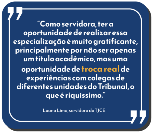 “Como servidora, ter a oportunidade de realizar essa especialização é muito gratificante, principalmente por não ser apenas um título acadêmico, mas uma oportunidade de troca real de experiências com colegas de diferentes unidades do Tribunal, o que é riquíssimo. O curso nos traz uma visão de gestão participativa, na qual o servidor entende seu papel como agente de mudança, capaz de motivar a equipe e promover um ambiente de trabalho mais colaborativo e focado em resultados”, descreve.
