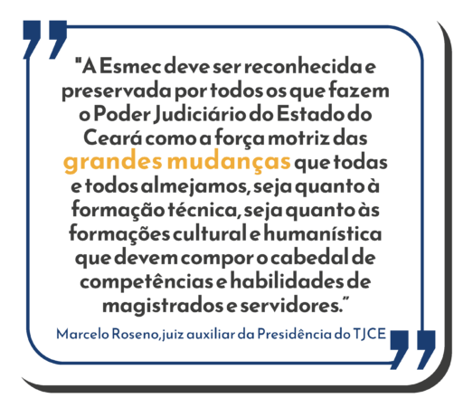 “A Esmec deve ser reconhecida e preservada por todos os que fazem o Poder Judiciário do Estado do Ceará como a força motriz das grandes mudanças que todas e todos almejamos, seja quanto à formação técnica, seja quanto às formações cultural e humanística que devem compor o cabedal de competências e habilidades de magistrados e servidores. O maior compromisso que devemos ter é de prestigiar seus cursos e eventos, dar cada vez mais vida e movimento à Escola, e garantir-lhe uma existência ainda mais longa e vitoriosa”, salienta o juiz Marcelo Roseno.
