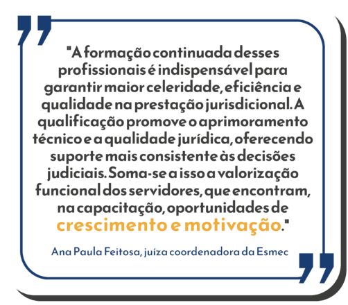 “A formação continuada desses profissionais é indispensável para garantir maior celeridade, eficiência e qualidade na prestação jurisdicional. A qualificação promove o aprimoramento técnico e a qualidade jurídica, oferecendo suporte mais consistente às decisões judiciais. Soma-se a isso a valorização funcional dos servidores, que encontram, na capacitação, oportunidades de crescimento e motivação”, defende a coordenadora da Esmec.
