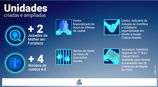 A Lei nº 18.781 amplia a estrutura física e de mão de obra do Judiciário cearense, provendo servidores(as) em unidades já existentes e em novas. Além dos 208 cargos já citados, foram criados mais de 200 outros cargos, entre servidores(as) (comissionados e efetivos) e juízes(as). Entre as unidades recém-criadas, estão dois novos Juizados da Mulher em Fortaleza; quatro Núcleos de Justiça 4.0; um Centro Especializado de Apoio às Vítimas da Capital; um Núcleo de Apoio às Varas de Execuções Penais; e um Centro Judiciário de Solução de Conflitos e Cidadania, especializado em Direito à Saúde (Cejusc/Saúde).
