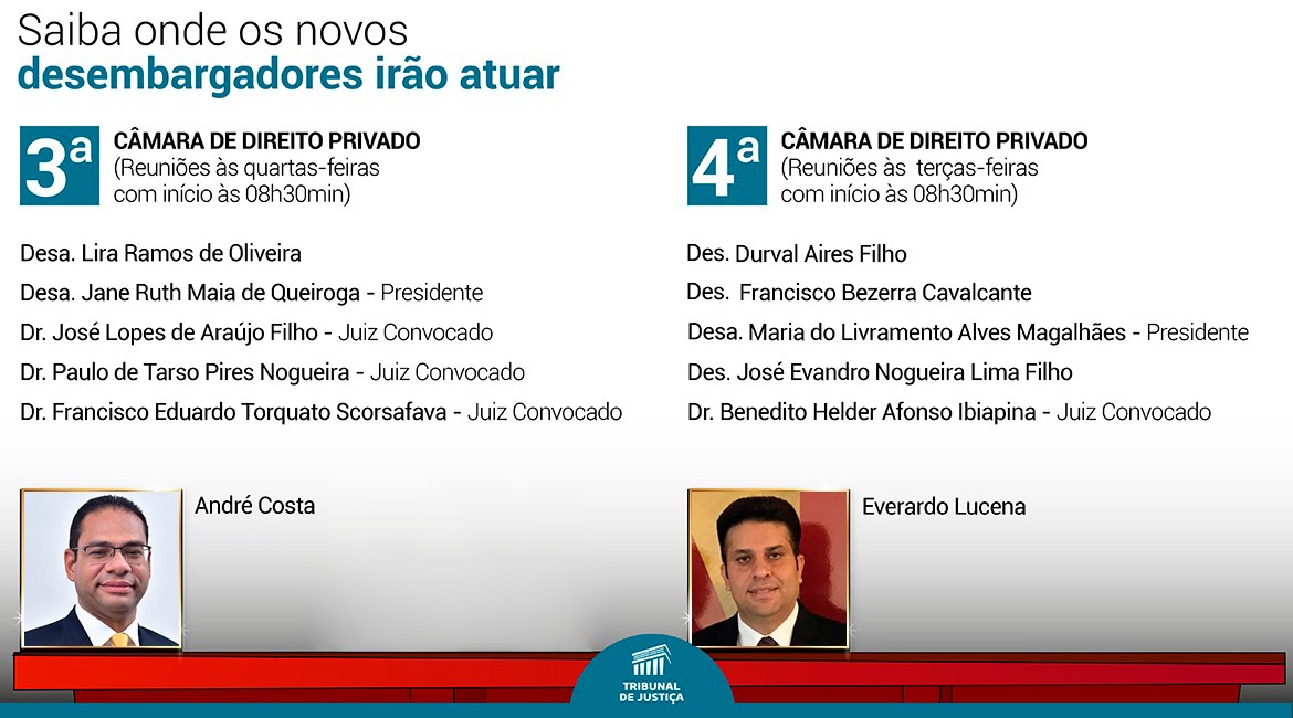 Conforme sorteio realizado durante sessão do Pleno do Tribunal, André Costa atuará na 3ª Câmara de Direito Privado, enquanto Everardo Lucena integrará a 4ª Câmara de Direito Privado. Os futuros magistrados estiveram reunidos com a chefe do Poder Judiciário estadual, desembargadora Maria Nailde Pinheiro Nogueira, no dia 31 de março, logo após serem nomeados por Camilo Santana, que ainda estava à frente do Poder Executivo Estadual.