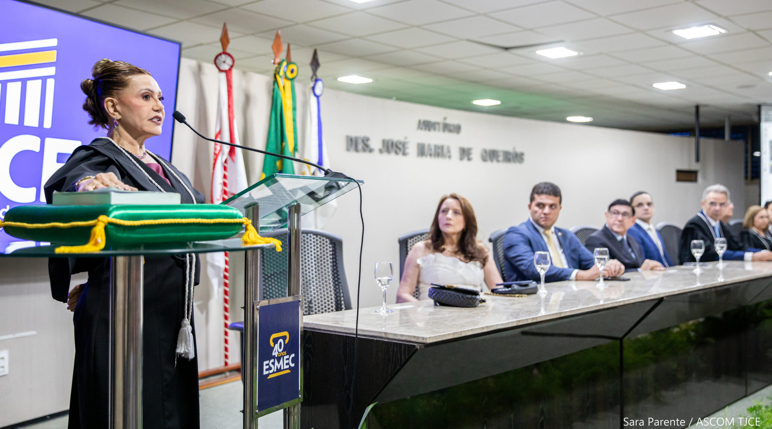 A solenidade foi conduzida pelo presidente do TJCE, desembargador Heráclito Vieira de Sousa Neto. Além dele e da nova desembargadora, compuseram a mesa de honra: o procurador-geral do Estado, Rafael Machado; o procurador-geral do Município de Fortaleza, Hélio Leitão; a presidente do Tribunal Regional Eleitoral do Ceará (TRE-CE), desembargadora Maria Iraneide Moura Silva; o presidente do Tribunal Regional Federal da 5ª Região (TRF-5), desembargador Roberto Machado; o procurador-geral de Justiça do Ceará, Hebert Gonçalves Santos; o presidente do Tribunal de Contas do Estado (TCE), conselheiro Rholden Botelho de Queiroz; o vice-presidente da Ordem dos Advogados do Brasil no Ceará (OAB-CE), David Sombra Peixoto; a defensora pública-geral do Estado, Sâmia Farias; e a vice-presidente da Associação Cearense de Magistrados (ACM), juíza Helga Medved.