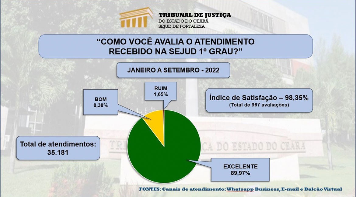 De janeiro a setembro deste ano, a Sejud Fortaleza realizou 35.181 atendimentos por meio dos canais WhatsApp Business, e-mail e Balcão Virtual, obtendo o índice de satisfação de 98,35%. Deste total, 89,97% classificaram como excelente os serviços prestados pela Unidade.