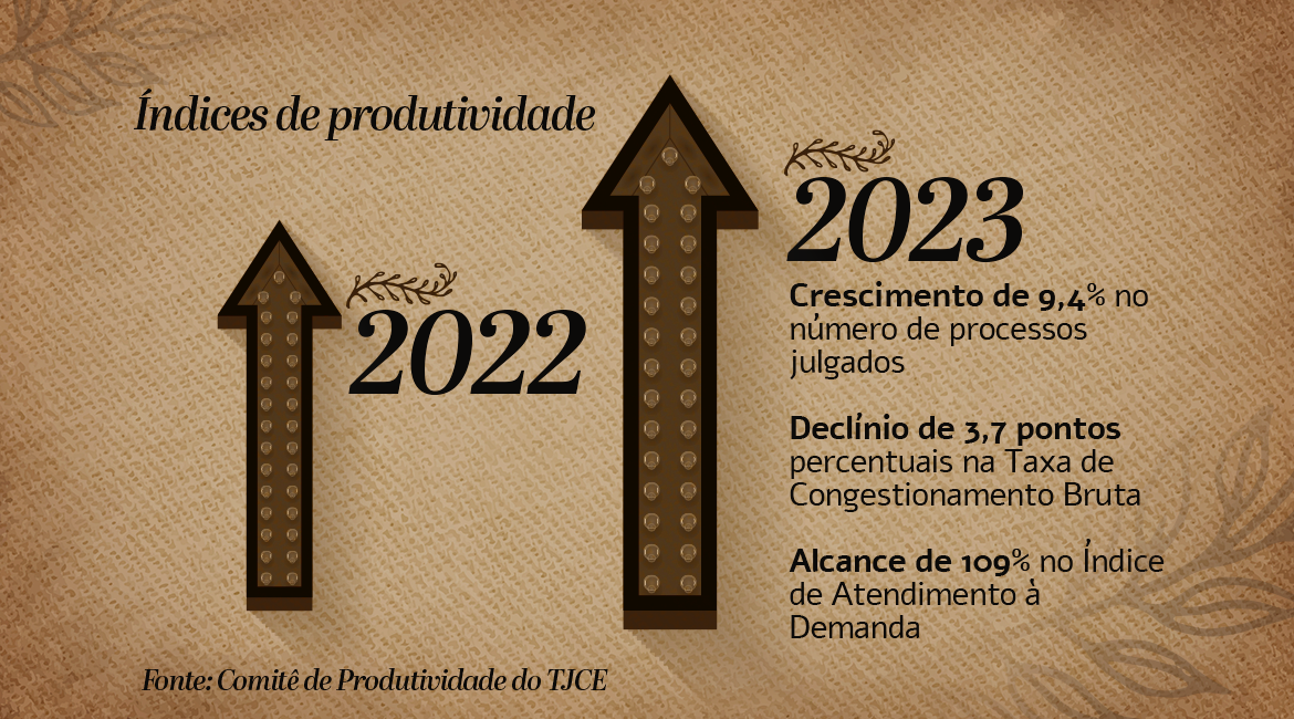 Os índices de produtividade de 2023, apresentados pelo Comitê de Produtividade do TJCE, apontaram crescimento de 9,4% em relação a 2022 no número de processos julgados. No ano passado, 638.787 ações foram movimentadas, 60 mil a mais que em 2022 (578.741). Além disso, foram realizadas 627.559 baixas processuais. Importante destacar que, em 2023, o Poder Judiciário recebeu 575.833 novos casos, o que representa um aumento de 14,1% em relação ao ano anterior. Na Taxa de Congestionamento Bruta, houve declínio de 3,7 pontos percentuais, em relação a 2022. Já no Índice de Atendimento à Demanda (IAD), o TJCE alcançou o resultado de 109%, o que indica que está conseguindo reduzir o acervo processual.