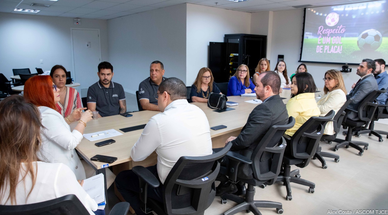A Coordenadoria Estadual da Mulher em Situação de Violência Doméstica e Familiar do Tribunal de Justiça do Ceará (TJCE) se reuniu, nesta quinta-feira (12/02), com instituições parceiras da campanha “Respeito é um Gol de Placa”, que visa transformar estádios em espaços de mais respeito e equidade de gênero. O objetivo do encontro, na sede do Poder Judiciário, foi iniciar os preparativos para a ação que ocorrerá na final do Campeonato Cearense de Futebol, marcada para 08 de março, Dia Internacional da Mulher.