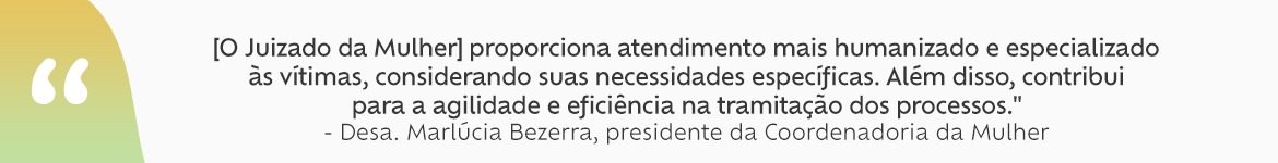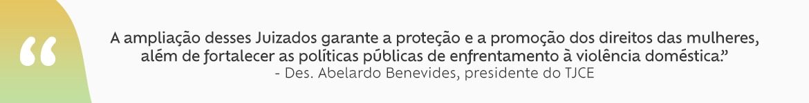 Durante discurso de posse, em janeiro de 2023, o desembargador Abelardo Benevides Moraes, presidente do Tribunal de Justiça do Ceará (TJCE), declarou compromisso de valorização e proteção da mulher e, ao longo da Gestão, vem reafirmando o posicionamento da Administração em defesa da temática. A população cearense conta hoje com a atuação de sete Juizados de Violência Doméstica e Familiar contra a Mulher: dois na Capital e cinco no Interior (Caucaia, Sobral, Crato, Juazeiro do Norte e Maracanaú).