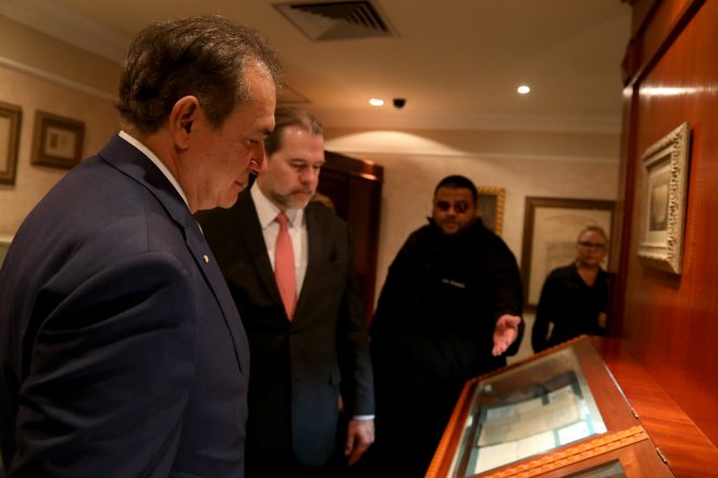 Ainda no encontro, Dias Toffoli entregou ao desembargador Washington Araújo publicações do STF e recebeu do presidente do TJCE o livro “Tribunal de Justiça do Ceará – 140 anos” e um manuscrito do jurista Clóvis Beviláqua.