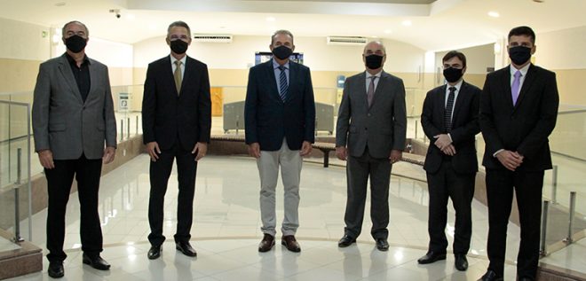 Acompanhando a visita estiveram o futuro diretor da Escola, desembargador Francisco Luciano Lima Rodrigues; o futuro coordenador-geral, juiz Alexandre Santos Bezerra Sá; o superintendente da Área Administrativa do TJ, Luis Eduardo de Menezes Lima; e o secretário de Administração e Infraestrutura do Tribunal, Moisés Costa.