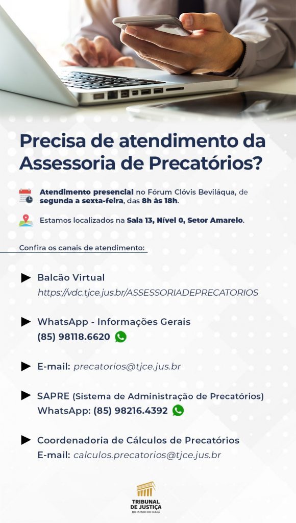 Para otimizar o atendimento ao cidadão, a Assessoria de Precatórios do Tribunal de Justiça do Ceará (TJCE) passa a receber o público de forma presencial, a partir dessa segunda-feira (06/03), no Fórum Clóvis Beviláqua (FCB). A sala, localizada no Setor Amarelo, Nível 0, número 13, conta com servidores à disposição para receber demandas e tirar dúvidas sobre o assunto das 8h às 18h.