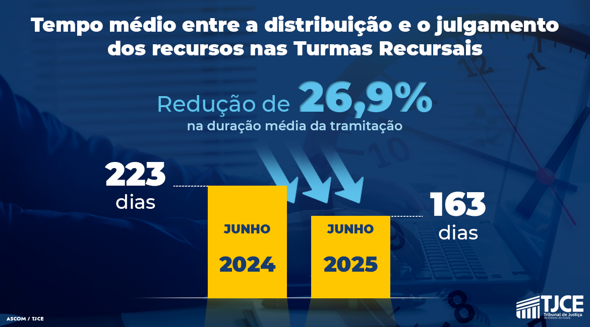 Outro dado relevante refere-se à celeridade processual. O tempo médio entre a distribuição e o julgamento dos recursos caiu de 223 dias, em junho de 2024, para 163 dias em junho de 2025, o que representa uma redução de 26,9% na duração média da tramitação.